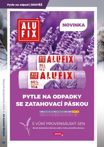 Pytle na odpad | SOUTĚŽ eshop.smero.cz • nejen kancelářské potřeby KÓD TYP BD* CENA AKČNÍ CENA 7 222 606 30 l 50 × 60 cm 15 µm 15 ks 40 45 Kč 41 Kč 7 222 607 60 l 60 × 70 cm 15 µm 10 ks 46 45 Kč 41 Kč KOUPIT 22