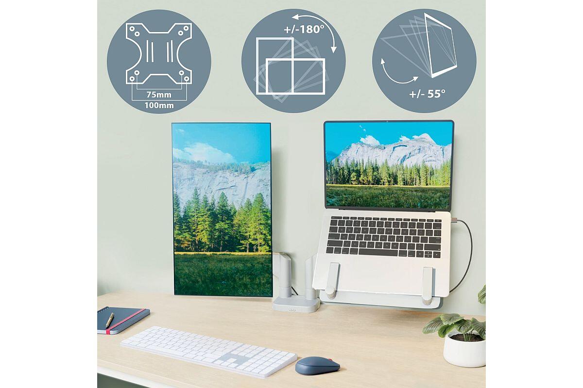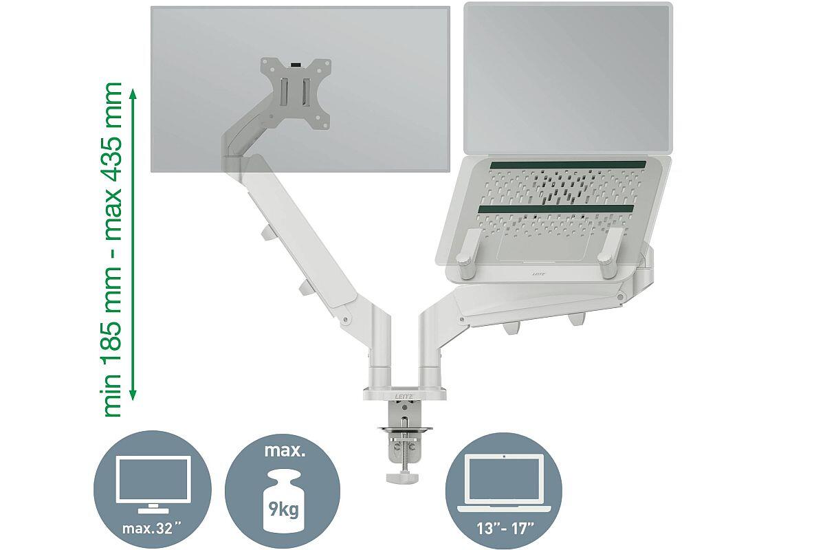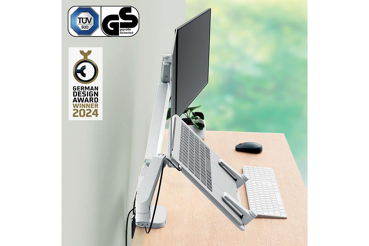 - ergonomické duální rameno zlepšuje držení těla a pohodlí při práci s monitorem a notebookem