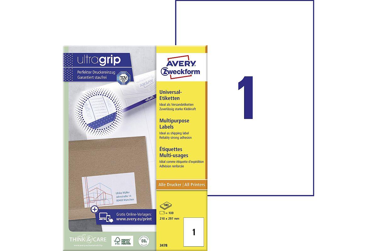 Etikety univerzální Avery Zweckform, 210 x 297 mm, arch A4, 100 listů, bílé