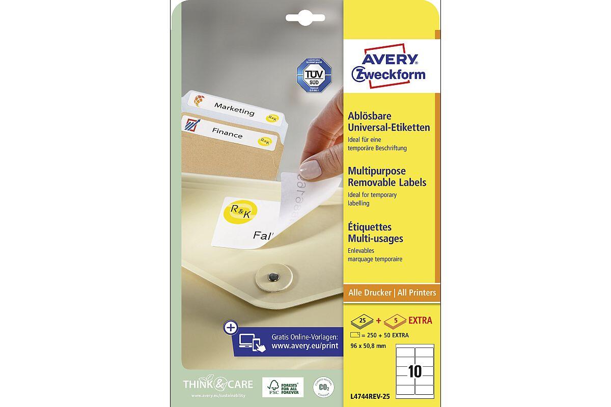 Etikety univerzální Avery Zweckform, 96x50,8 mm, arch A4, snímatelné, 25+5 listů, bílé
