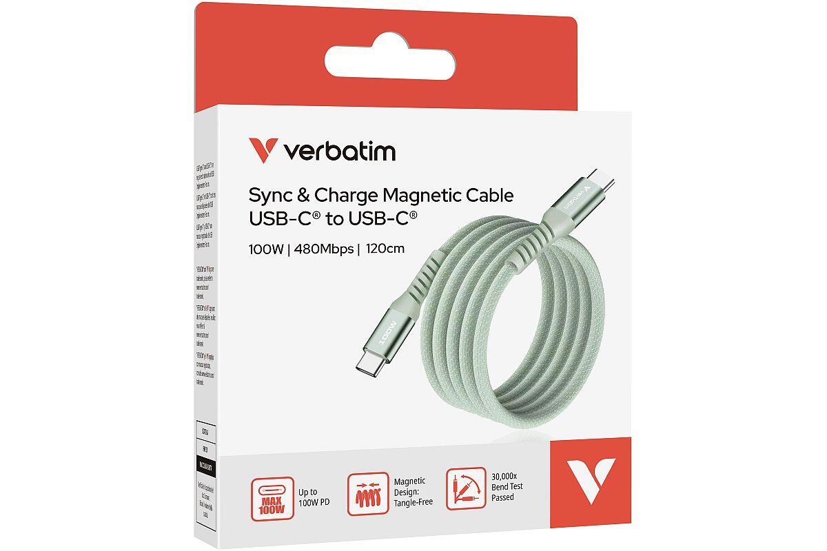 Kabel USB Verbatim Sync & Charge 31855, USB-C samec - USB-C samec, 1,2 m, 100 W, magnetický, zelený