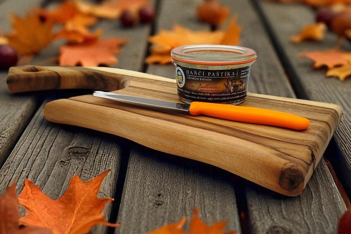 Prkénko z masívního dřeva, s paštikou a nožem, č. 1