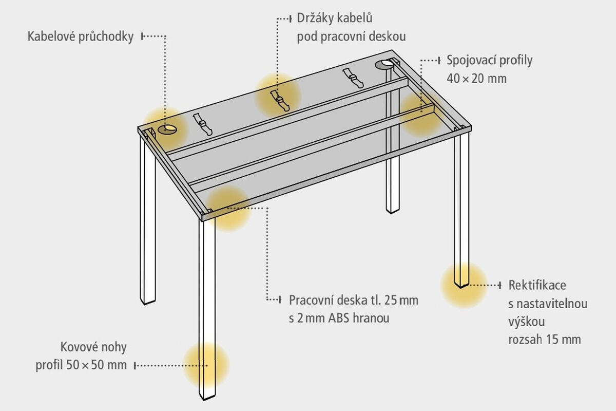 - pracovní deska s tloušťkou 25 mm je osazena ABS hranou o tloušťce 2 mm, která stůl pomáhá chránit před poškozením